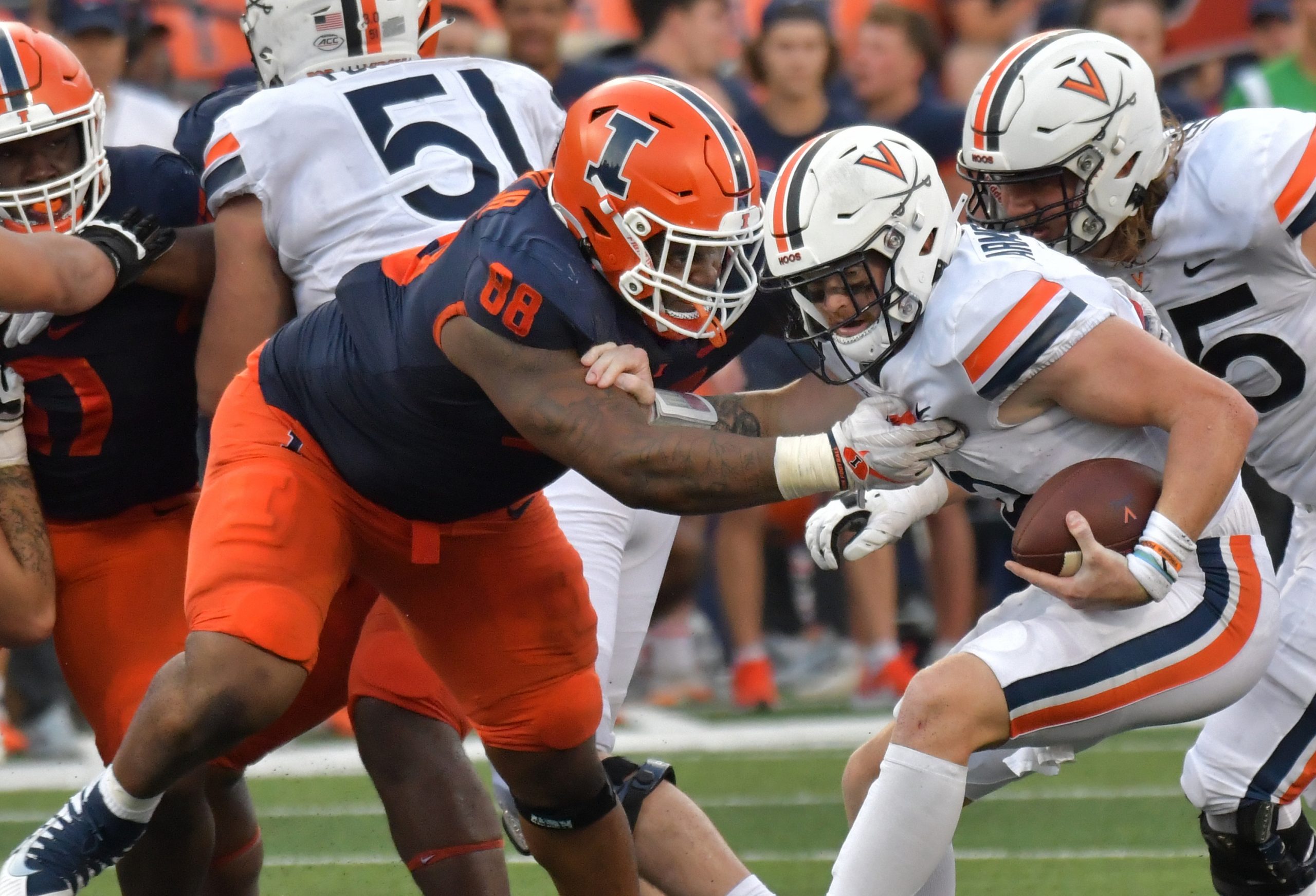 As Illini Head Coach Bielema exclaimed in his post-game presser “Ryan’s Defense just kept sawing wood.” Fighting through the grit of 4 offense turnovers by the Illini, and a massive scoring drought that lasted from the second quarter, well into the third. Through it all Walters defense was still able to shine. The Virginia offense was only able to produce 3 points, and 222 total yards of production, and only converted 1 of its 16 third down attempts. Not only were you able to successfully keep One of the top offenses in the nation only a season ago completely out of the end zone, but you did it in quite dominant fashion. This paired with only 42 yards rushing the entire game for the Virginia offense, who was completely dismantled up front by Illinois’ Johnny Newton and Keith Randolph.