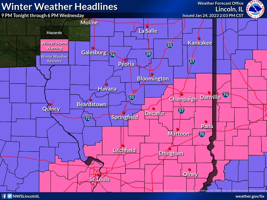 - Town of Normal: Snow parking ban on all streets from 5 a.m., Wednesday, Jan. 25 through noon Thursday, Jan. 26.