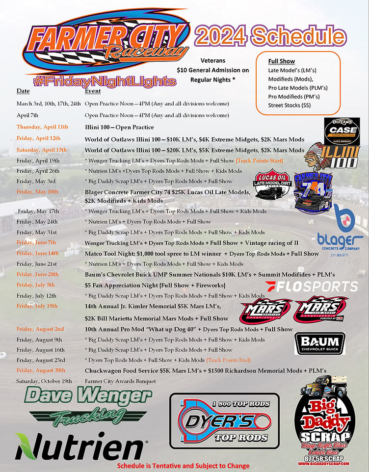 FARMER CITY RACEWAY is back for another season high octane racing action on the dirt track. Catch the action during their Friday Night Lights series every Friday throughout the summer! (Schedule to the right, click on image)